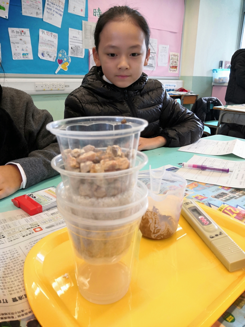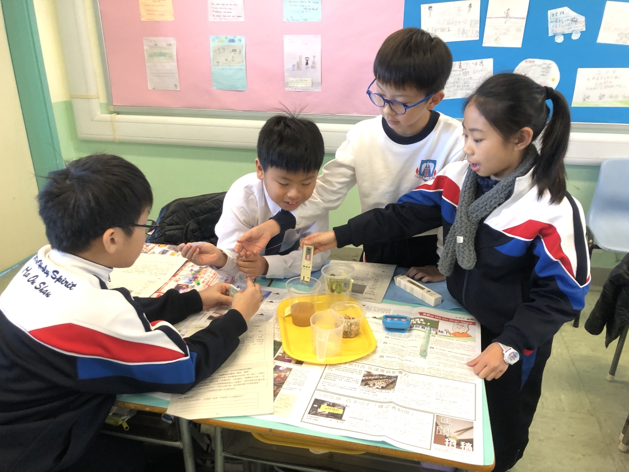 四年級的校本課程以「水與生活」為主題,目標是讓學生明白淡水資源的珍貴,了解香港的食水處理過程,最後透過動手操作,製作一個效能良好的濾水器。在教學過程中滲入公平測試的概念,教導學生如何搜集、紀錄及分析數據,應用設計循環的原則,製作一個濾水器。